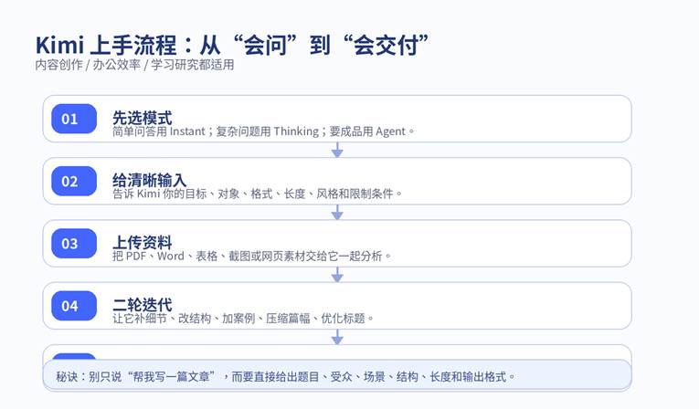 • 把 Kimi 当“协作对象”,不是“自动完成器”;你参与越深,结果通常越好。