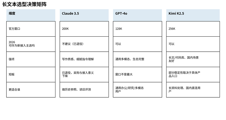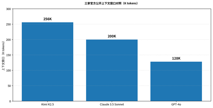 | Kimi K2.5 | 256K tokens | 现役 | 这组三者里官方窗口最大,适合长文资料、代码库和国内直连场景 | 长资料问答、项目文档、代码仓理解 |