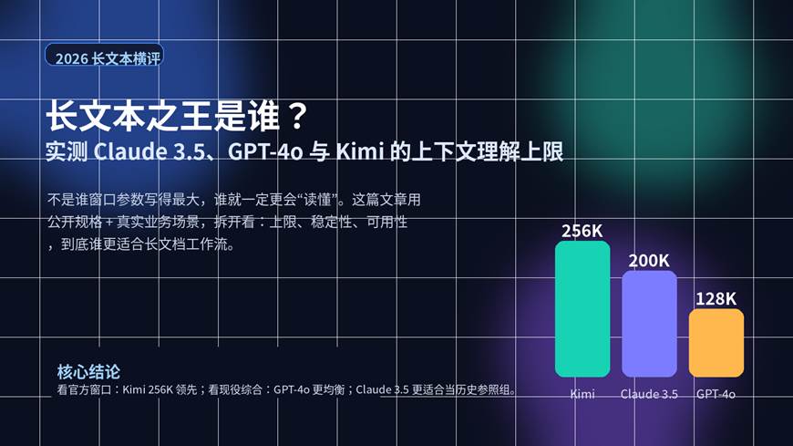 如果只看宣传页上的“上下文窗口”,Kimi 256K、Claude 3.5 Sonnet 200K、GPT-4o 128K,答案似乎一眼就出来了。但真正做长文档工作流的人都知道:窗口大小只是门槛,不是终局。真正决定体验的,往往是模型在超长上下文里的定位能力、跨段归纳能力、尾部指令保持能力、文件入口体验,以及你在 2026 年到底还能不能稳定接入它。