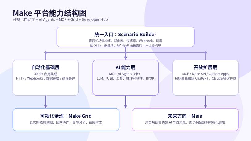 更关键的是,Make 在 2025—2026 这一轮产品演进里,已经把 AI Agents、MCP、Make Grid、自然语言构建能力 Maia 等能力纳入主线。这意味着它不再只是在“连应用”,而是在朝“自动化系统 + AI 智能体协同层”升级。