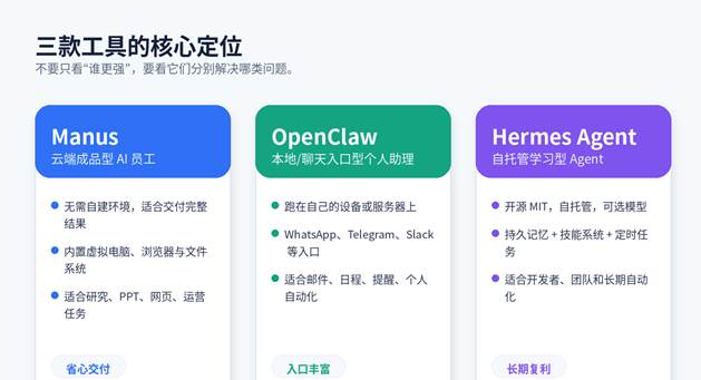 图:Manus、OpenClaw、Hermes 的三条路线定位