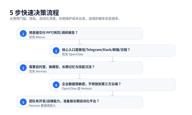 图:Manus、OpenClaw、Hermes 快速决策流程