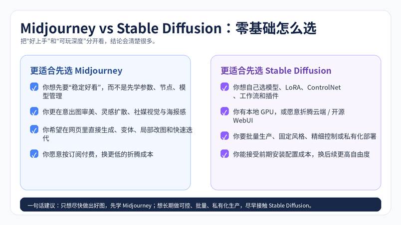 先说结论:如果你是完全零基础,想尽快做出“看起来就很像样”的图片,优先选 Midjourney;如果你明确知道自己后面会做固定风格、角色一致性、批量生产、私有化或本地部署,Stable Diffusion 更值得长期投入。
