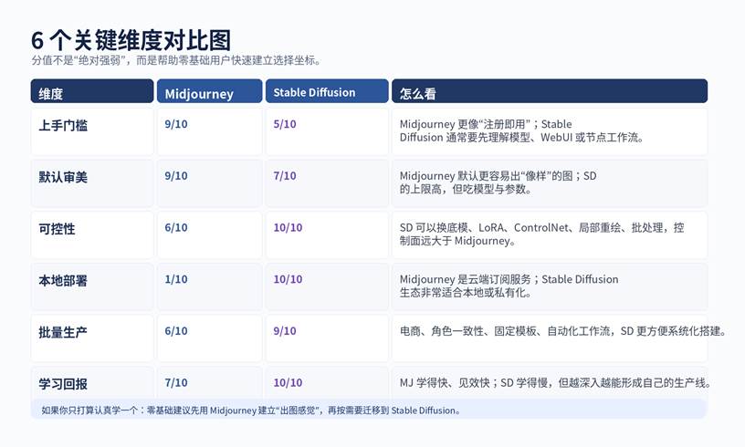 一句话收尾:Midjourney 适合先把“图做出来”,Stable Diffusion 适合把“图的生产系统做起来”。