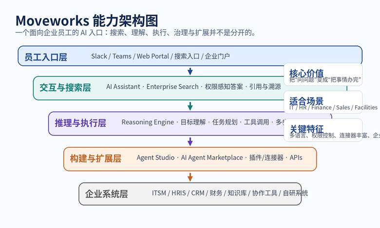 图 1  Moveworks 的能力并不是单一聊天框,而是一个面向企业搜索与执行的多层平台。
