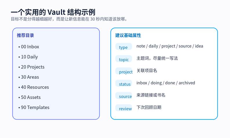 • 早期不要同时维护多个 Vault;一个主 Vault 足够。