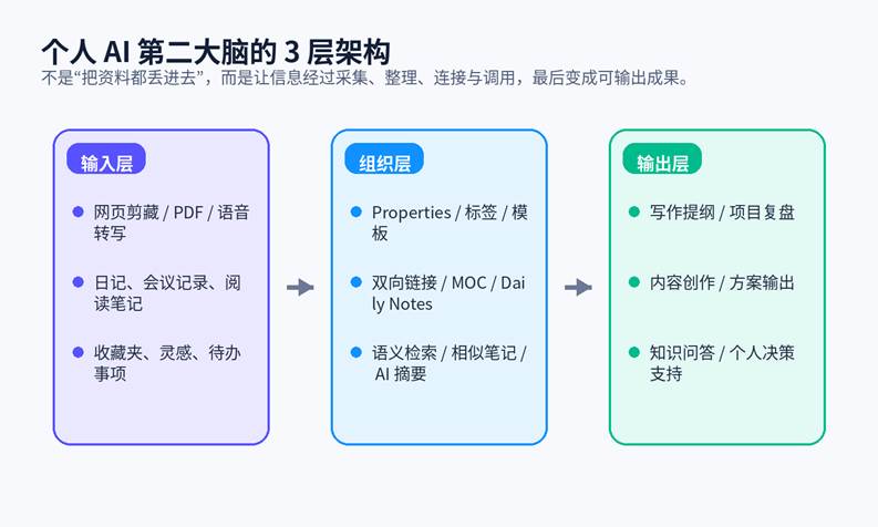 从结果看,一个成熟的个人 AI 第二大脑至少要做到四件事:第一,能快速采集;第二,能形成结构;第三,能在需要时找回来;第四,能在 AI 的帮助下把旧知识重新组织为新的产出。