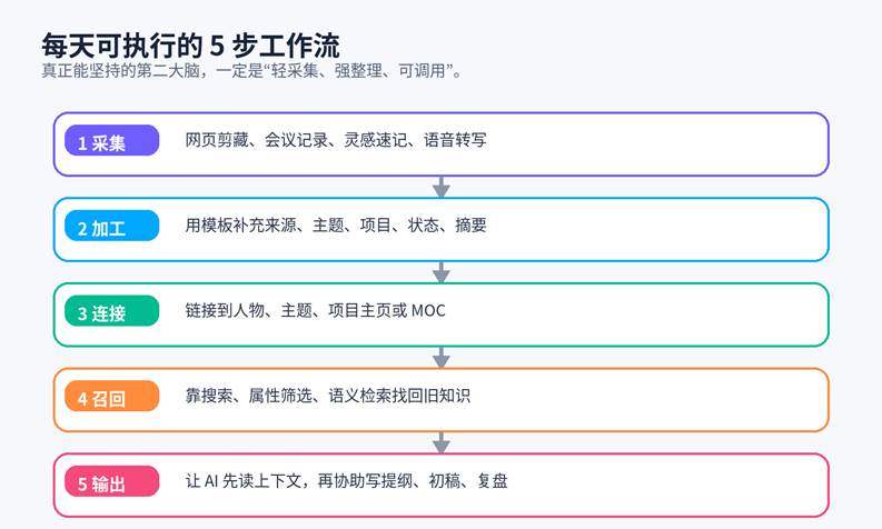 第二大脑不是周末花 8 小时整理一次,而是每天花 15 到 30 分钟维持系统更新。你可以照着下面这条流程执行。