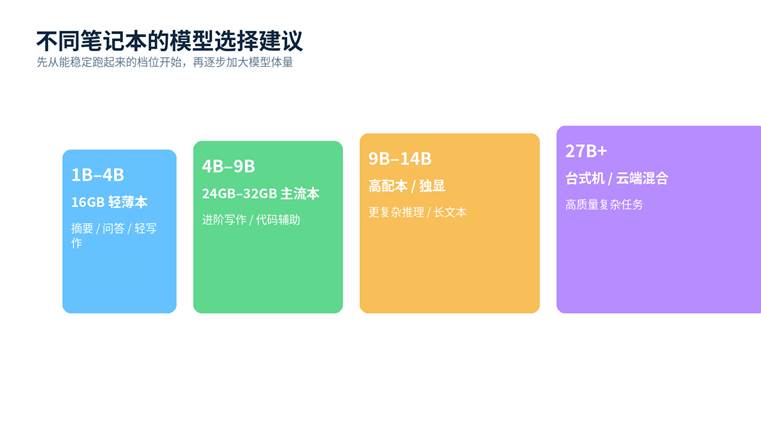 | 轻薄本 / 16GB 内存 | 1B~4B | 日常问答、摘要、简单写作 | 优先速度与稳定性,不要一上来拉 14B+ |