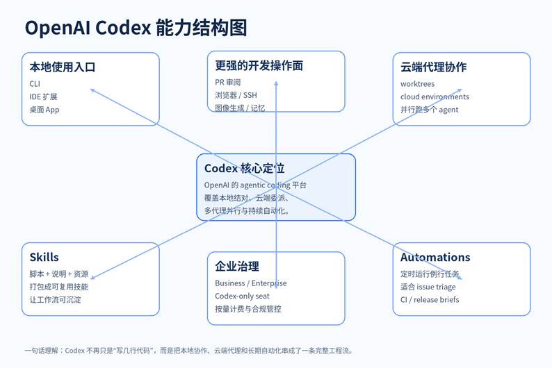 如果你把 OpenAI Codex 还理解成“一个更会写代码的聊天框”,那已经落后了。现在的 Codex 更像一个以 OpenAI 模型为核心、覆盖 CLI、IDE、桌面 App、云端多代理、Skills 和 Automations 的完整工程执行平台。它最强的地方,不是补全几行函数,而是把“看代码—做计划—改文件—跑测试—并行推进—持续自动化”整成一条闭环。