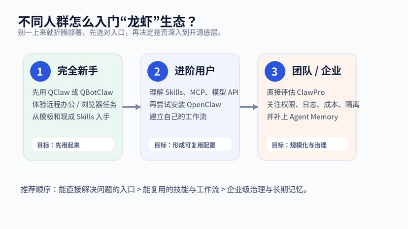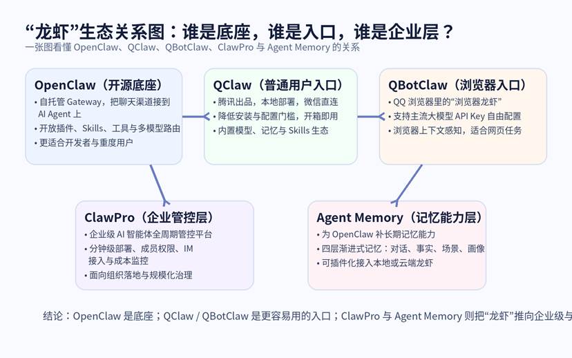 图 1:OpenClaw 是底座;QClaw / QBotClaw 是更易上手的入口;ClawPro / Agent Memory 指向企业与长期使用能力。