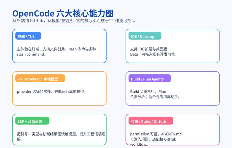 它之所以在开发者圈子里讨论度不断走高,原因通常集中在四点:第一,终端与 TUI 是主体验,不是附属入口;第二,模型接入非常开放,支持 75+ provider 和本地模型;第三,Build / Plan agent 让“先分析、后执行”的工作流更清晰;第四,LSP、权限、Rules、GitHub workflow 这些偏工程治理的能力,不是装饰品,而是产品路线的一部分。