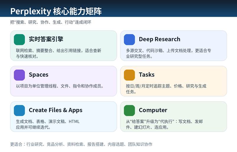 一句话概括: Perplexity 的核心价值,不是“像聊天机器人一样回答问题”,而是把“联网检索、证据引用、深度研究、项目协作、定时追踪、文件与应用生成”串成一条适合知识工作的完整链路。