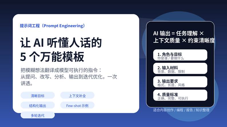如果你不想背模板,也可以记住下面这个通用骨架:角色 + 目标 + 上下文 + 输出要求 + 质量标准。只要把这五块补完整,大多数任务都会立刻变稳。