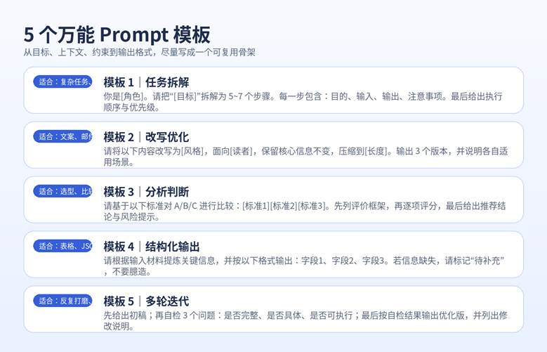 为了便于上手,下面我把最常见的 AI 任务,浓缩成 5 个万能模板。你可以直接复制后改参数,也可以把它们当成自己的 Prompt 骨架。
