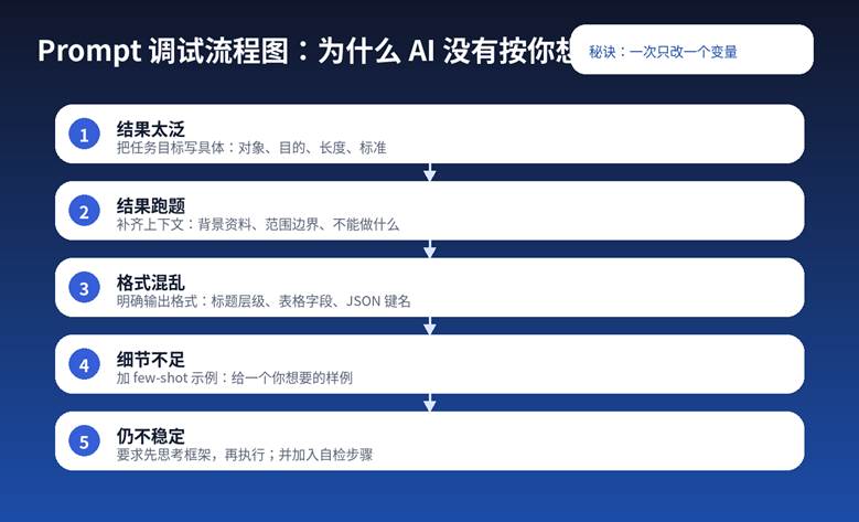 模型“答非所问”,往往不是因为它不聪明,而是因为你的任务没有被清楚地表达。最常见的失败有五类:目标模糊、上下文缺失、格式未定义、评价标准不明、一次塞入太多变化项。