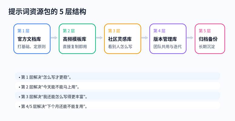 图 1  提示词资源包的 5 层结构:先学方法,再收模板,再补灵感,最后做版本管理与归档。