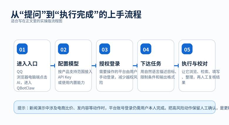 从已公开资料看,QBotClaw 的使用门槛明显低于传统“自己搭 Agent”。用户不必先搭环境、配一堆中间件,也不需要先理解复杂工作流编排,最核心的步骤仍然是:找到入口、进入产品、配置模型能力、授权必要的账号、下达清晰指令。