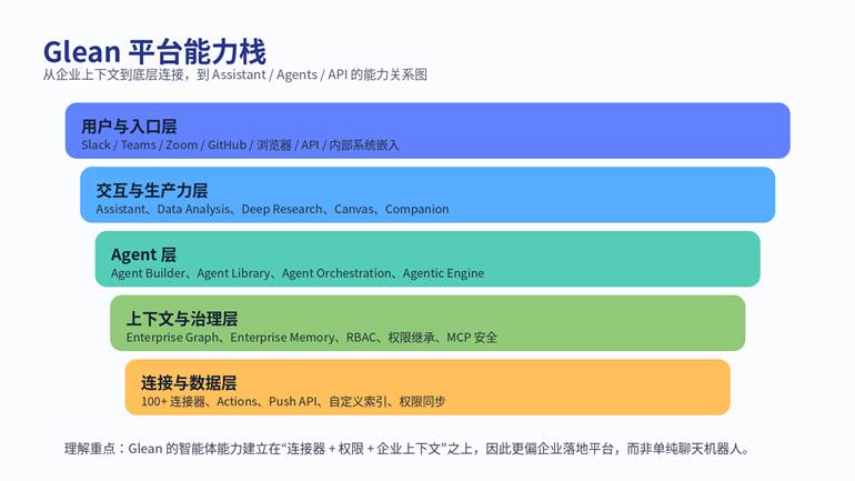 如果把 Glean 只理解成“企业搜索”,那就会低估它近两年的产品演进。从官方定位看,Glean 已经把自己放在 Work AI Platform 的位置上:上层是 Assistant、Data Analysis、Deep Research、Canvas 和 Agents,底层则依赖连接器、权限同步、企业图谱、企业记忆、模型选择与 Agentic Engine。因此,Glean 更适合被看成“面向企业知识与流程的 AI 平台”,而不是单点问答工具。