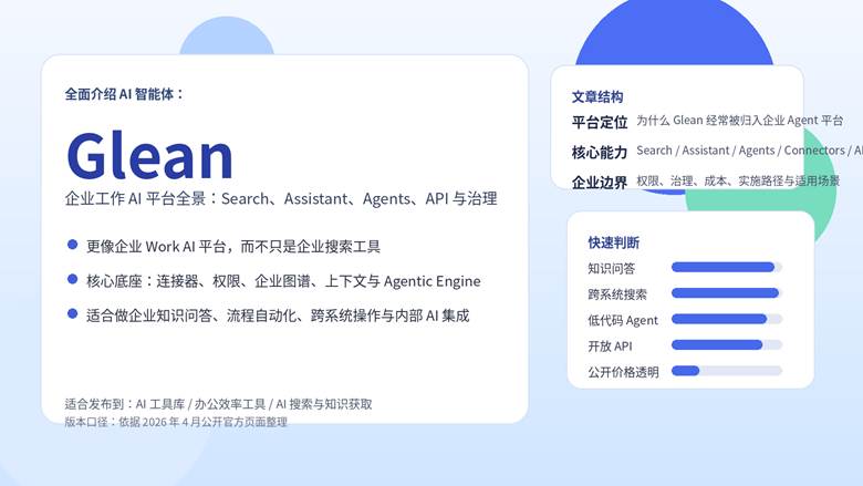 Glean 已经不只是传统意义上的企业搜索工具,而是在连接器、权限同步、企业图谱与企业记忆的基础上,向 Assistant、Agents、Actions、MCP 与 API 全面扩展的企业 Work AI 平台。本文从平台定位、核心能力、典型场景、上手路径和企业选型边界五个角度,全面介绍 Glean 为什么值得放进 AI 智能体平台序列里。