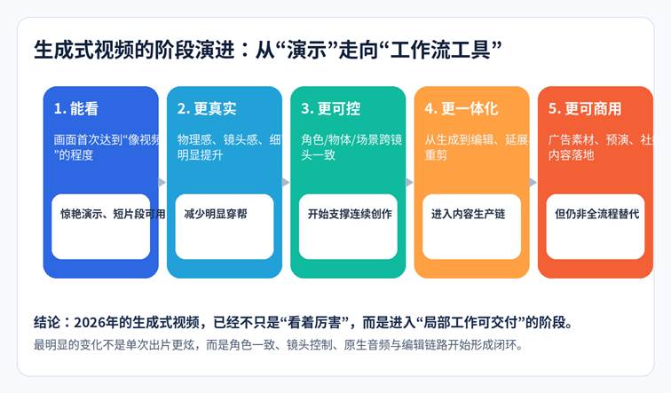 图 1|生成式视频的阶段演进:从演示能力走向工作流能力