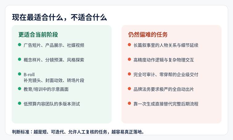 今天的生成式视频,已经越过了“只能做炫技演示”的阶段,正在进入“有明确边界的生产工具”阶段。它最适合的是:短时长、可拆分、可迭代、允许人工把关的内容;最不适合的是:长篇、高一致性、高审计要求、零容错的大型交付。