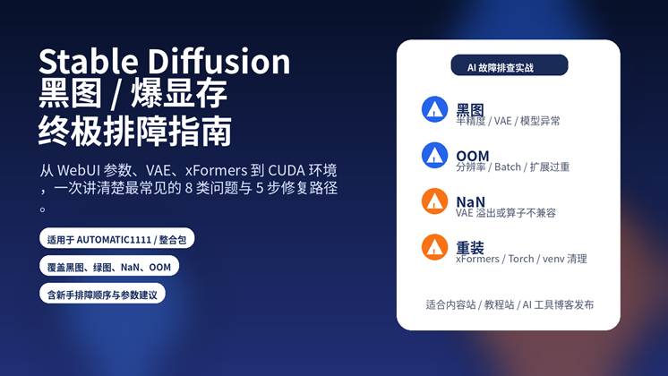 | 核心问题 黑图、绿图、灰图、VAE NaN、CUDA Out of Memory、xFormers 异常 | 阅读收益 先判断症状,再按优先级修复,减少反复重装和无效折腾 |
