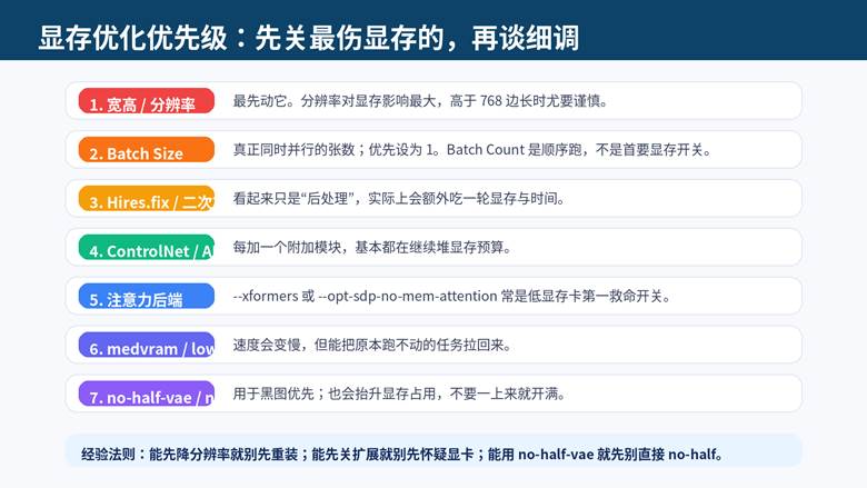 • 先砍分辨率,再看 Batch Size,再关 Hires.fix 和附加模块。