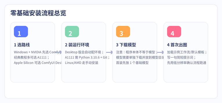 | 一句话先看懂: Stable Diffusion 本地安装的核心,不是“装一个软件”,而是先选对运行界面,再单独准备模型文件。 |