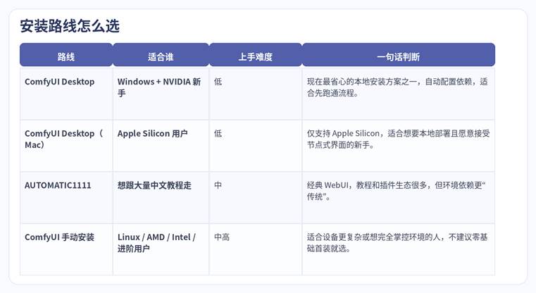 要点提醒:无论你用哪条路,模型文件依然要单独准备。本地 AI 绘图最常见误解,就是把“装好了软件”误以为“已经有模型可用”。