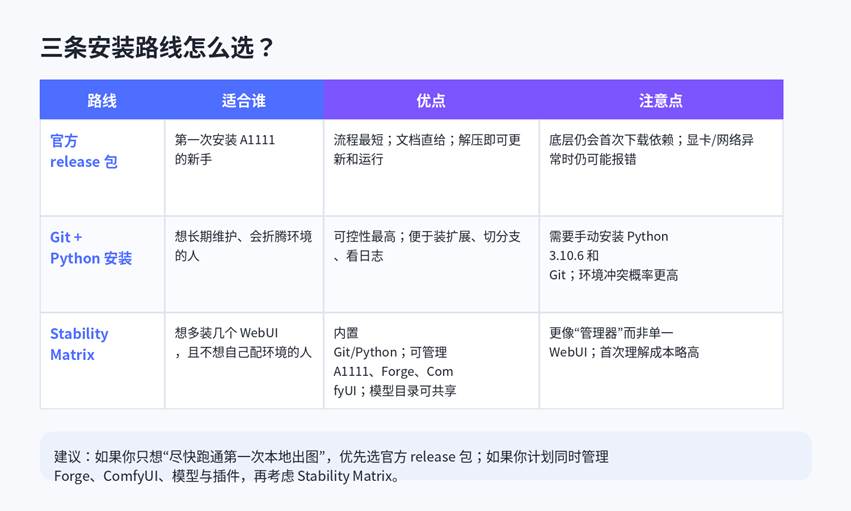 图 2 官方 release 包、Git 安装与 Stability Matrix 的区别