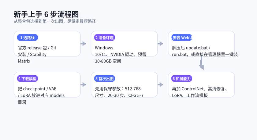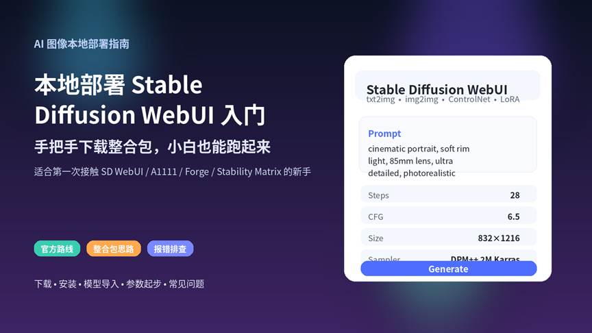 | 先把一句话说清楚:所谓“WebUI 整合包”,本质上是把 WebUI 程序、运行脚本与部分依赖包装成更容易启动的安装路线。对新手来说,优先选择官方 release 包或可信的管理器,比到处找来路不明的网盘整合包更稳。 |