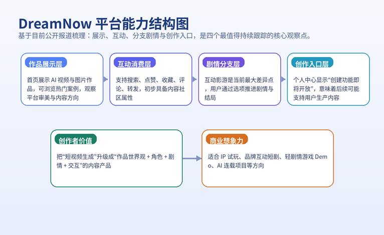 - DreamNow 当前公开定位更接近“AIGC 内容创作与互动平台”,而不是单点式的 AI 生图或 AI 视频工具。