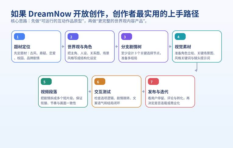- 对创作者而言,DreamNow 的机会不只是做短视频,而是把“角色 + 世界观 + 多结局剧情”打包成一个可持续运营的作品形态。
