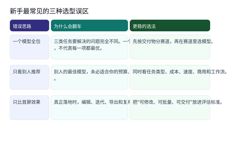 最稳的做法通常不是“选一个全能模型”,而是“为文字、图片、视频各配一个最顺手的主力模型”。