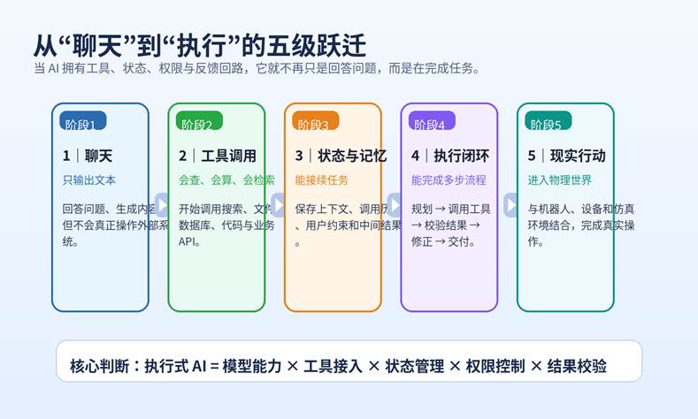 从聊天到执行,并不是 AI 抛弃对话,而是对话正在退回到入口层。真正决定价值的,将是 AI 能否把语言理解、工具使用、状态管理、环境感知与结果校验连接起来,形成可重复、可审计、可扩展的任务闭环。