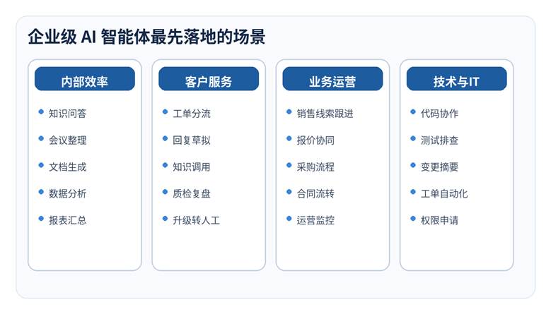 从现实节奏看,企业不会一上来就把高风险、全自动、跨部门的大流程全部交给智能体。最先落地的往往是四类场景。