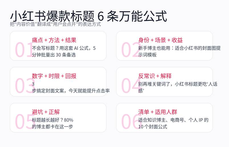 标题写作的底层逻辑只有一句话:把“内容里真正有价值的东西”,翻译成“用户愿意点开的表达方式”。下面这 6 条公式几乎覆盖了大多数小红书内容场景。