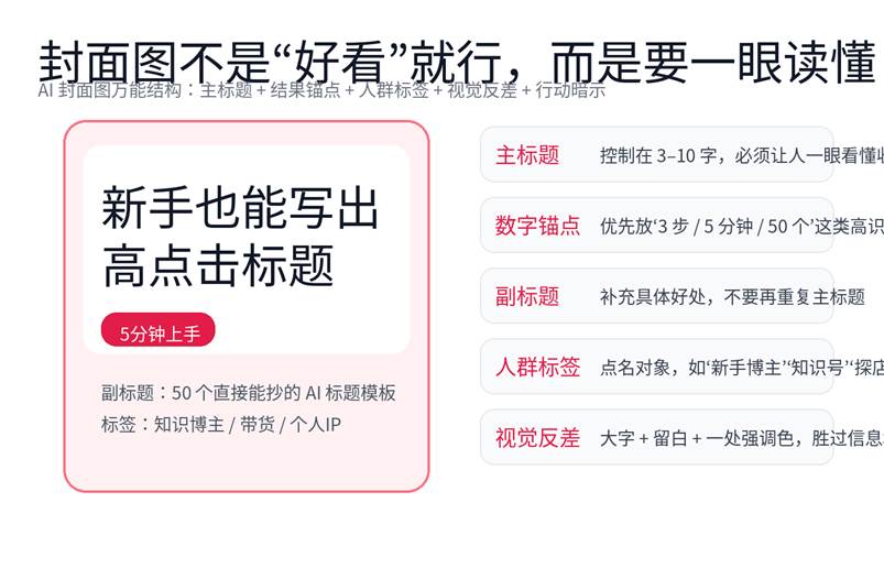 一个高点击封面,通常由五个要素构成:主标题、结果锚点、人群标签、副标题补充、视觉反差。主标题负责抓住注意力,结果锚点负责提升点击动机,人群标签负责让目标用户立刻产生“这是给我看的”感觉。